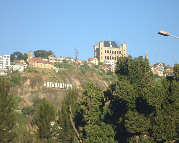 Antananarivo est située entre 1 200 et 1 465 mètres d’altitude. Au sommet de la colline se trouve le Rova, d’où l’on peut admirer la ville moderne et les rizières.